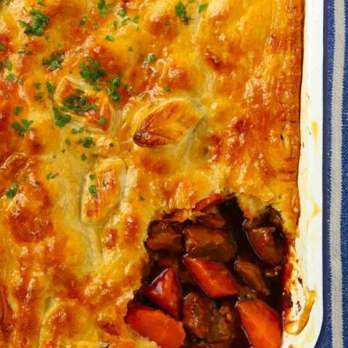 This recipe is filled with meltingly soft and tender beef, rich tasty gravy and topped with crunchy puff pastry.