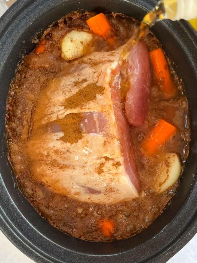 - Apple juice – Any type of apple juice (the cheap pure ones are fine!) The exact quantity will depend on the size of your slow cooker. Ideally the joint will be covered